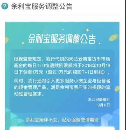 据9月11日官方消息,支付宝发布公告称,余额宝将再次做出调整。而继余额宝被调整之后,用户赖以生存的余利宝也逃脱不了被限制的命运。支付宝宣布:余利宝调整服务将从2018年10月18日开始实施,个人用户每日快速赎回金额从100万元下调到1万元人民币。届时,超过一万元的赎回将会在下一个交易日到账,余利宝企业用户快速赎回、快速到账的每日限额为500万元人民币,从公告看暂时不变!