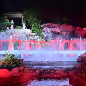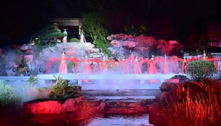 主办方将整个晚会的布景,完美的融入了园子面。一座设立在湖面、曲折有意的戏台,正好作为主舞台区,而平叠山水景观与潺潺的水瀑,成为了独一无二的舞台背景,而在山水上方的亭景、分布有致的石景,均成为表演区的一部分,结合无数美轮美奂的灯光映衬之下,一幅光彩熠熠的“立体山水画卷”跃然眼前。