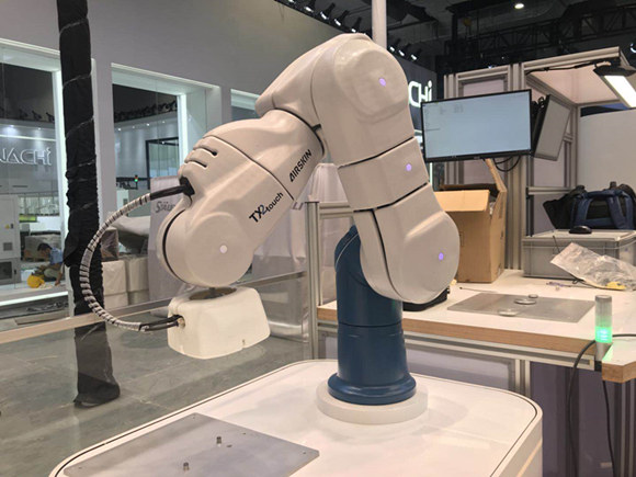 史陶比尔就带来了三款即将在中国首发的机器人产品,分别为全封闭式SCARA TS2机器人、HelMo移动式机器人和TX2touch协作机器人。其中,TX2touch机器人今年6月才在德国发布。史陶比尔(杭州)机密机械电子有限公司工业机器人事业部刘霁月对界面新闻记者表示,这款机器人配置了安全皮肤,且满足严苛的人机协作情境、机器人受触碰后就会停止工作。
