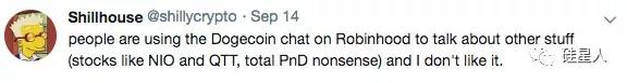而一名专注炒作狗狗币的博主也在 Twitter 上表示,在交易软件 Robinhood 的狗狗币专区,人们却在讨论蔚来、趣头条,这让他“很不爽”。