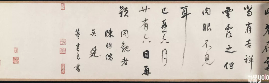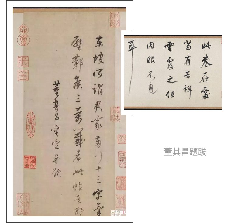 明朝万历三十二年(1604),董其昌见《行穰帖》时叹为观止,在作品上留下了小楷题签“王右军行穰帖”,还在卷后作了释文和数段跋文,以苏东坡的诗句为跋,对此摹本不吝赞赏:“东坡所谓‘君家两行十三字,气压邺侯三万签’者,此帖是耶?”“观其行笔苍劲,兼籀篆之奇纵,唐以后虞、褚诸名家,视之远愧,真希代之宝也。”隔了五年,他又写:“此卷在处,当有吉祥云覆之,但肉眼不见耳!”