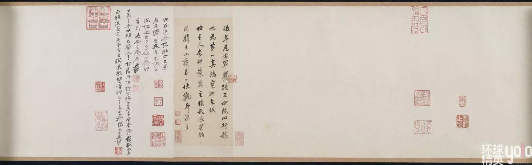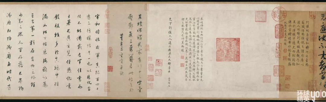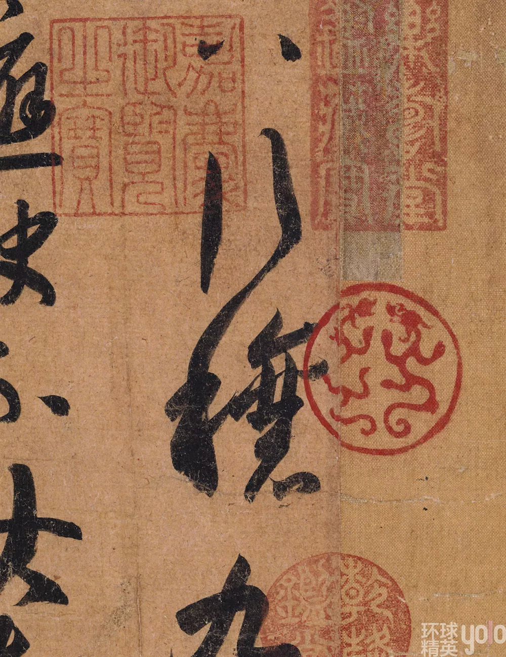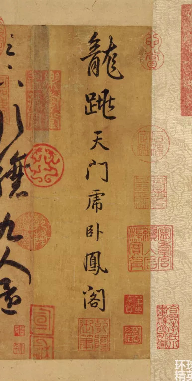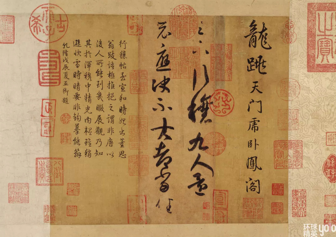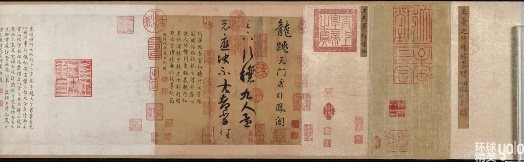 1747年《行穰帖》被收入乾隆皇帝的《三希堂法帖》中,“盖章狂魔”乾隆当然不会放过它,如今全卷上依然留有乾隆的题跋弹幕及钤印点赞,比如在黄绝前隔水引梁武帝评语题行书“龙跳天门,虎卧凤阁”八字,下铃“乾隆御笔”朱文方印,其后又盖了“乾隆鉴赏”“乾隆御览之宝”“古希天子”“八微髦念之宝”等诸多钤印。