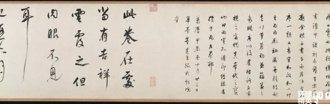 张大千在卷首盖了个大大的“大风堂”收藏章,中间那方“望云草堂”白文印是李经迈的收藏章。
