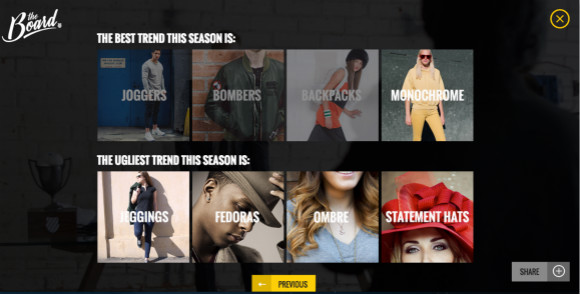接着便是从8种不同穿搭风格的图片中选择当季最喜欢的流行趋势和你认为当季最丑的流行趋势。这还没有结束,最后你需要拍摄一个一两分钟的短视频,展示你的风格、激情和企业精神,来告诉Diplo和K-SWISS你为什么能得到董事这个职位。最后你需要把视频传到Youtube上标注K-SWISS标签,并分享链接到Twitter上@K-SWISS。