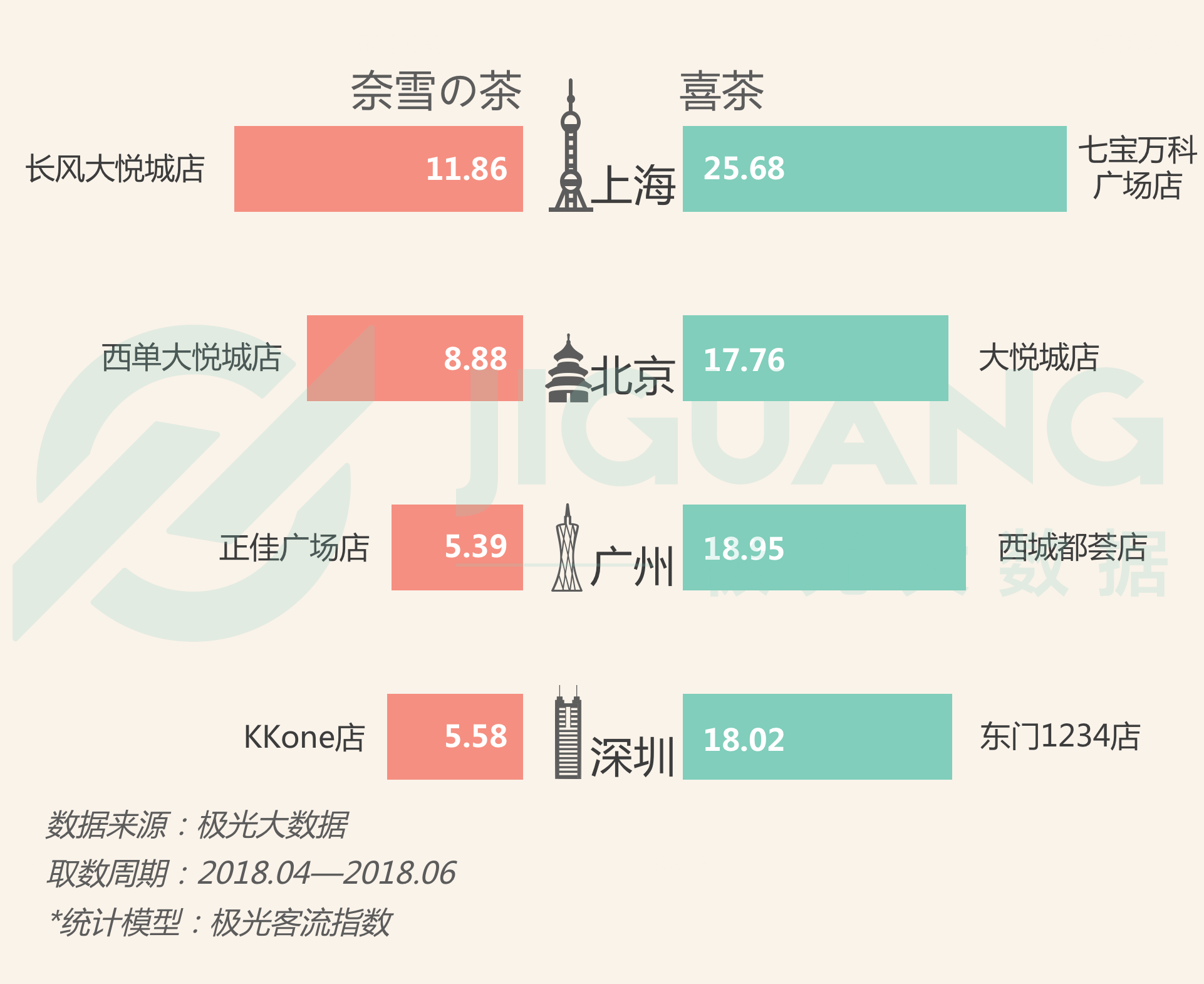 『 喜茶 』& 『奈雪の茶』一线城市客流总量指数对比