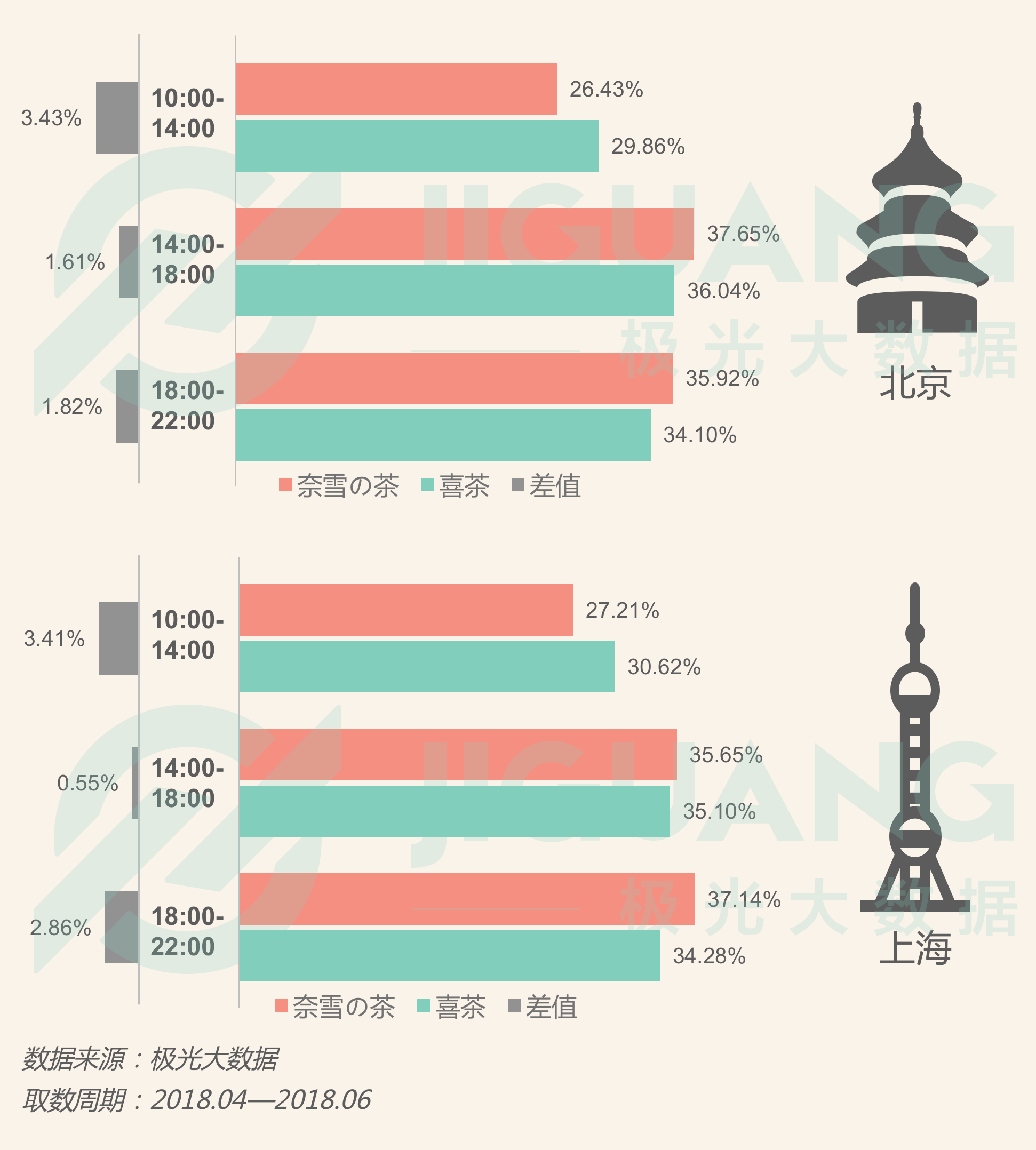 在北京和上海,喜茶人群更喜欢在快节奏的中午时段捎走一杯茶;而在悠闲自得的下午和繁忙一天后的晚上,奈雪の茶人群更喜欢品一杯茶。