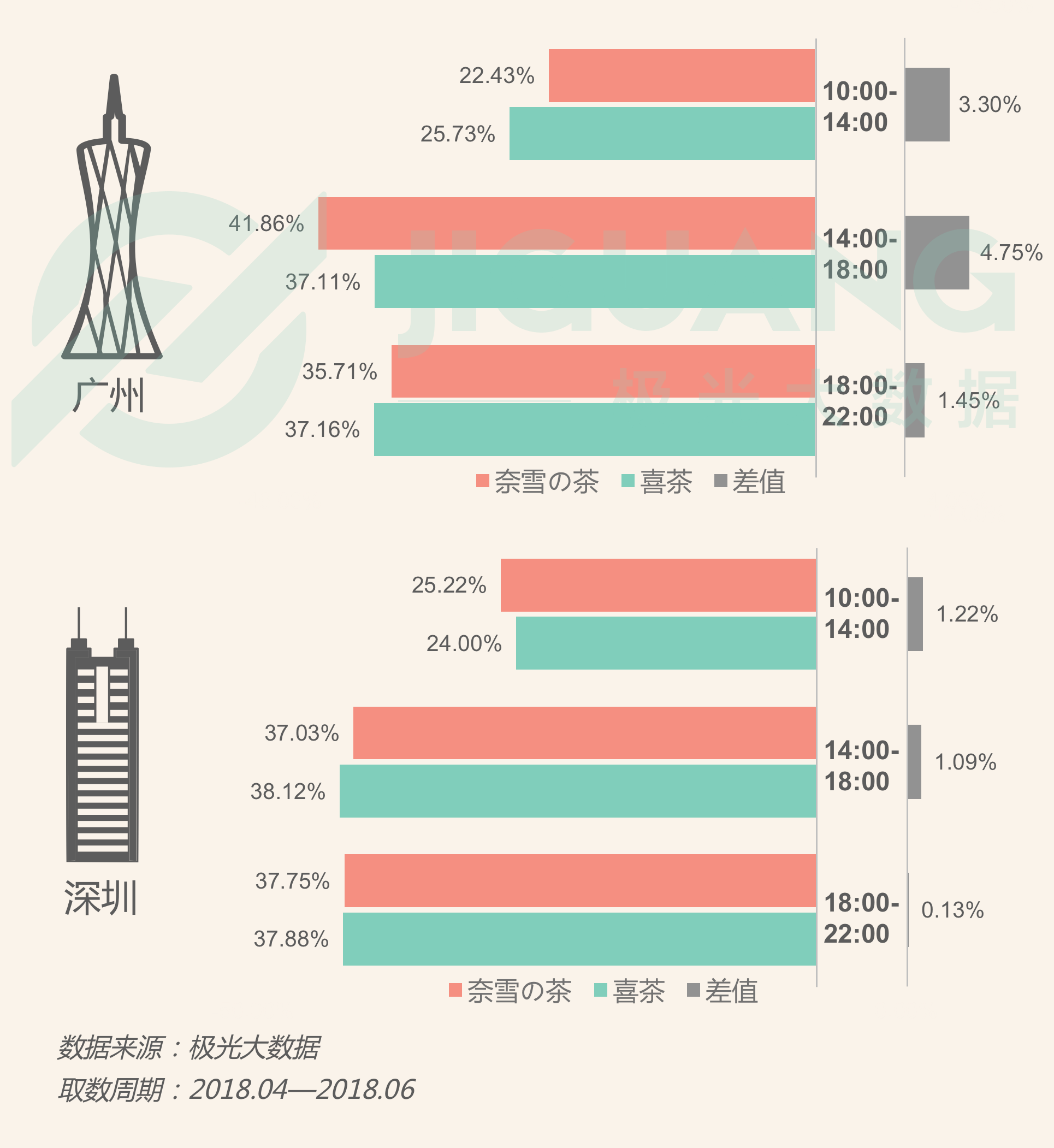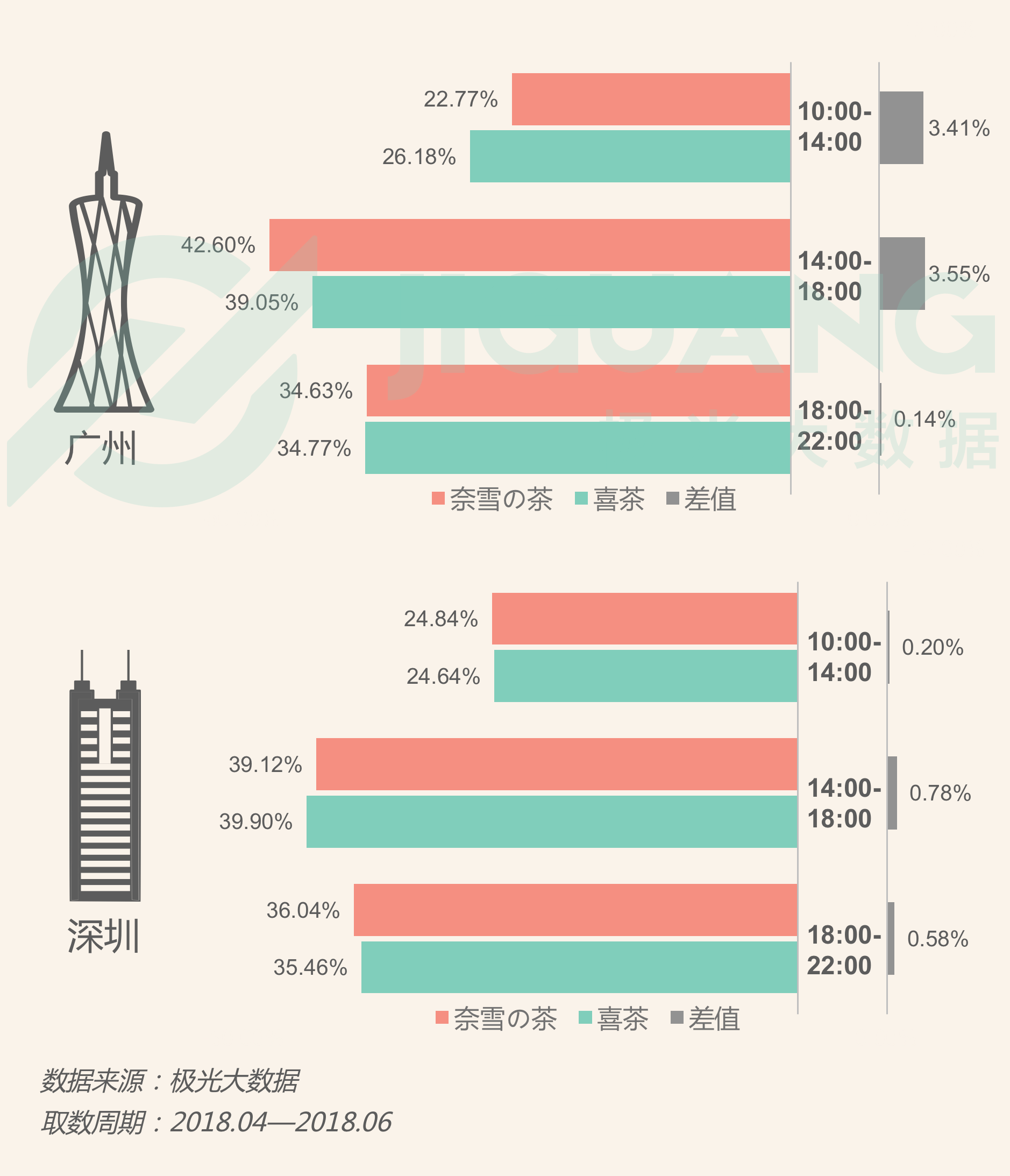 相比喜茶人群,广州的奈雪の茶人群更享受下午时段去店里喝茶的快乐。