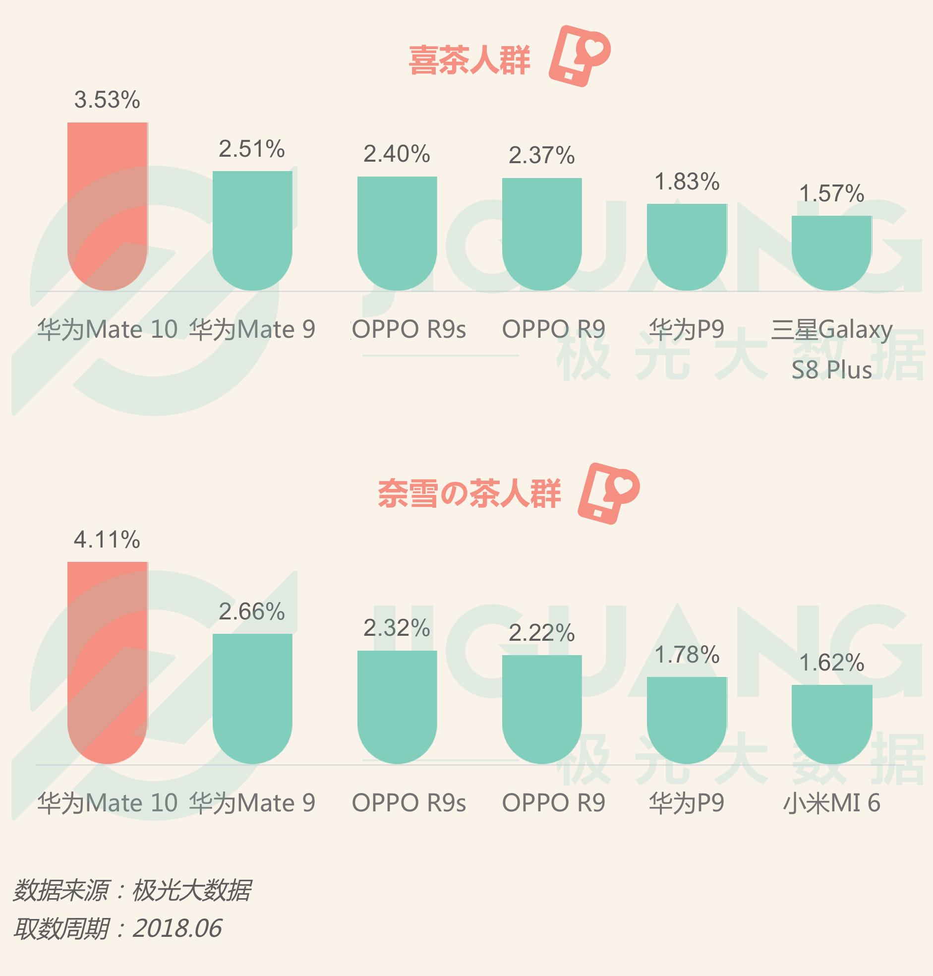 - 华为Mate 10和Mate 9机型最受喜茶&奈雪の茶人群欢迎。