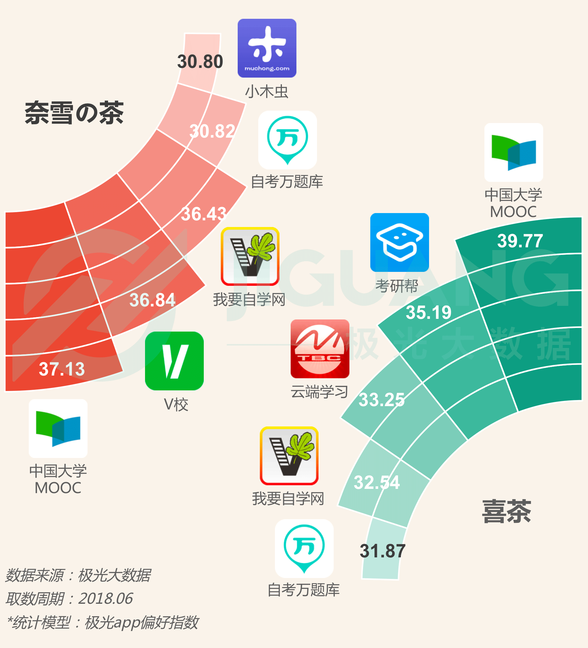 中国大学MOOC是喜茶和奈雪の茶人群最偏好的教育类应用。
