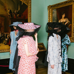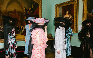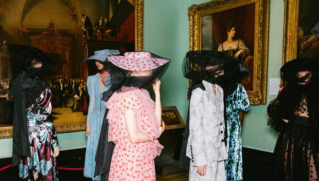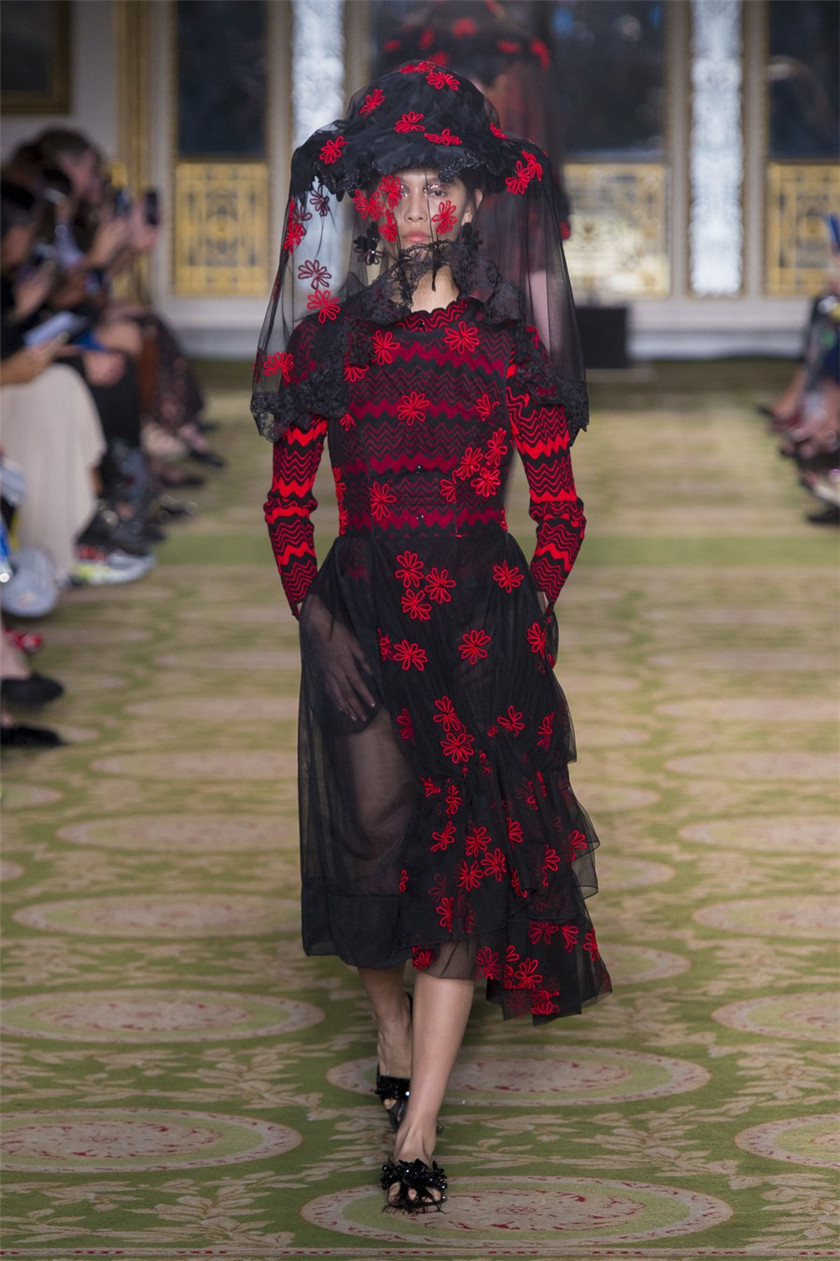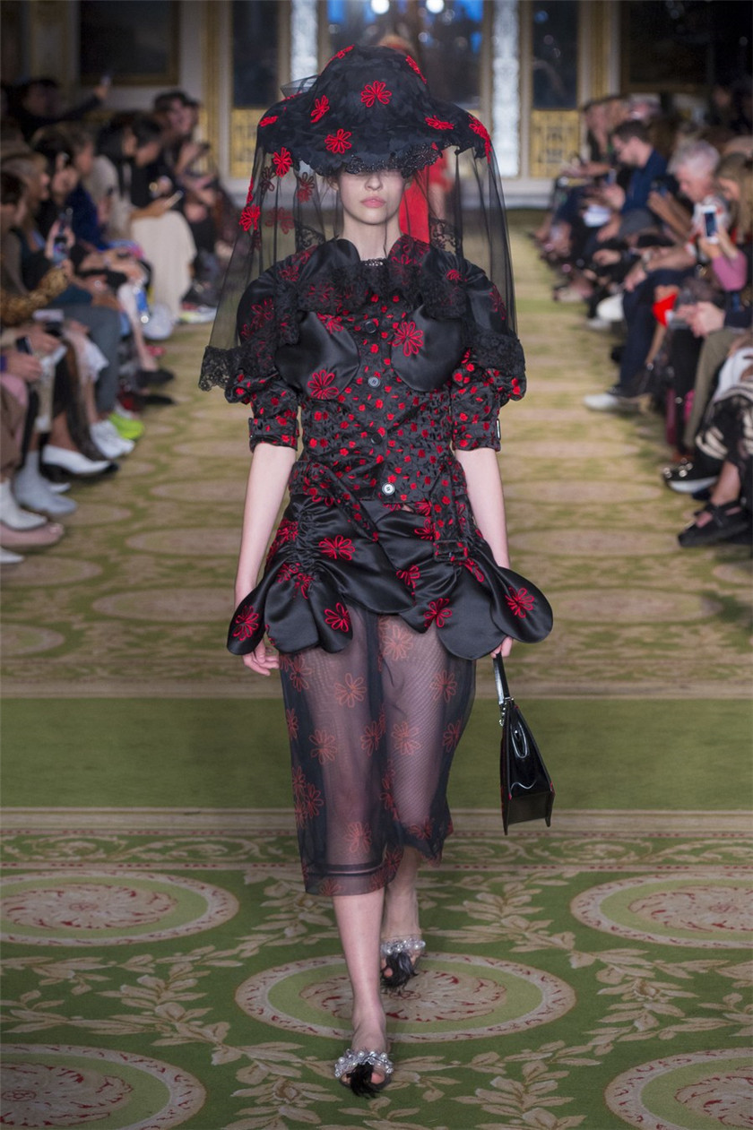 有趣的是,由于借用了中国斗笠的元素,Simone Rocha在设计麦子的同时,也采用了半透明的薄纱面料,并在黑色的纱上面绣上了红花。除了美观,大概这种帽子的这样效果也会更胜一筹。