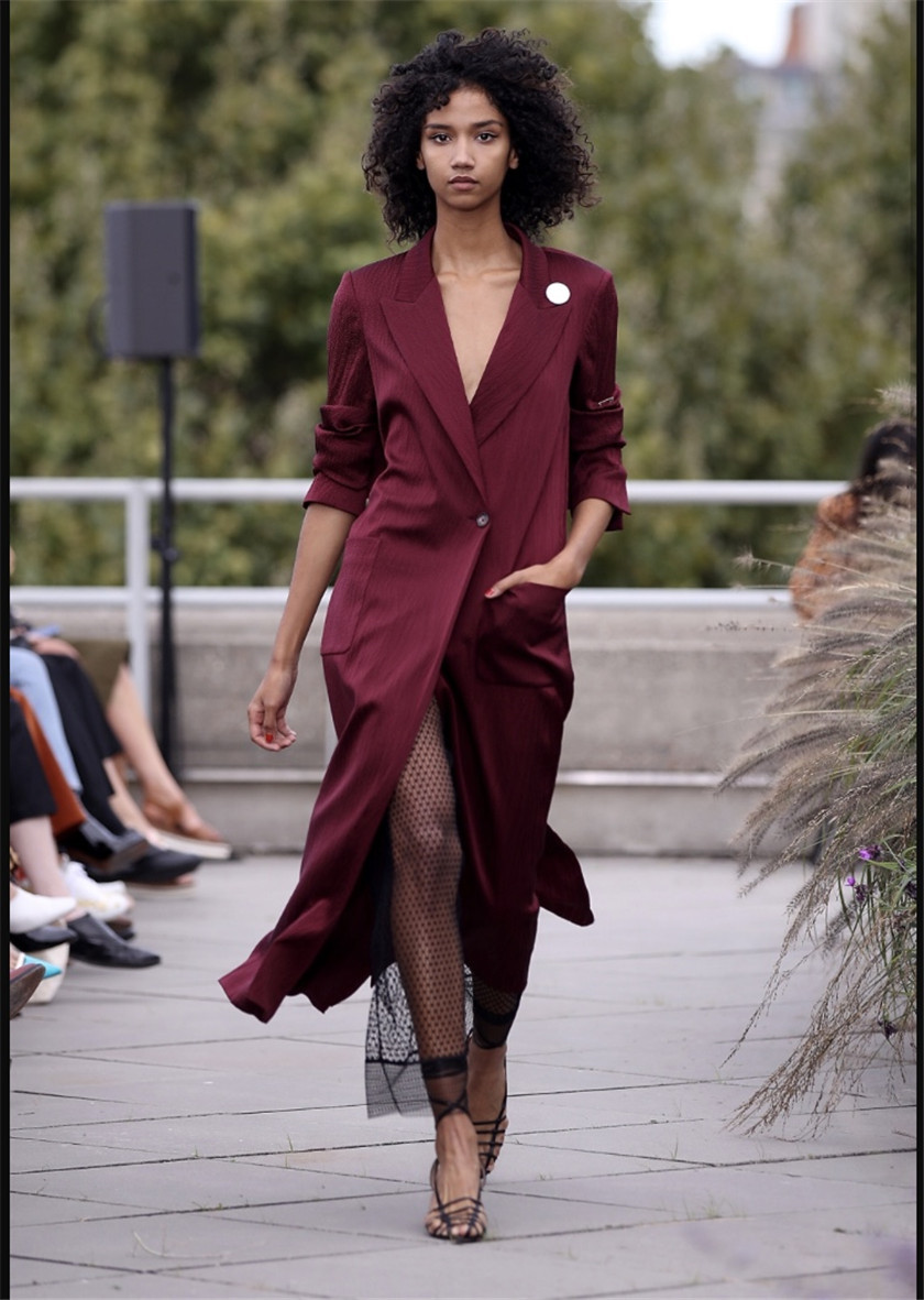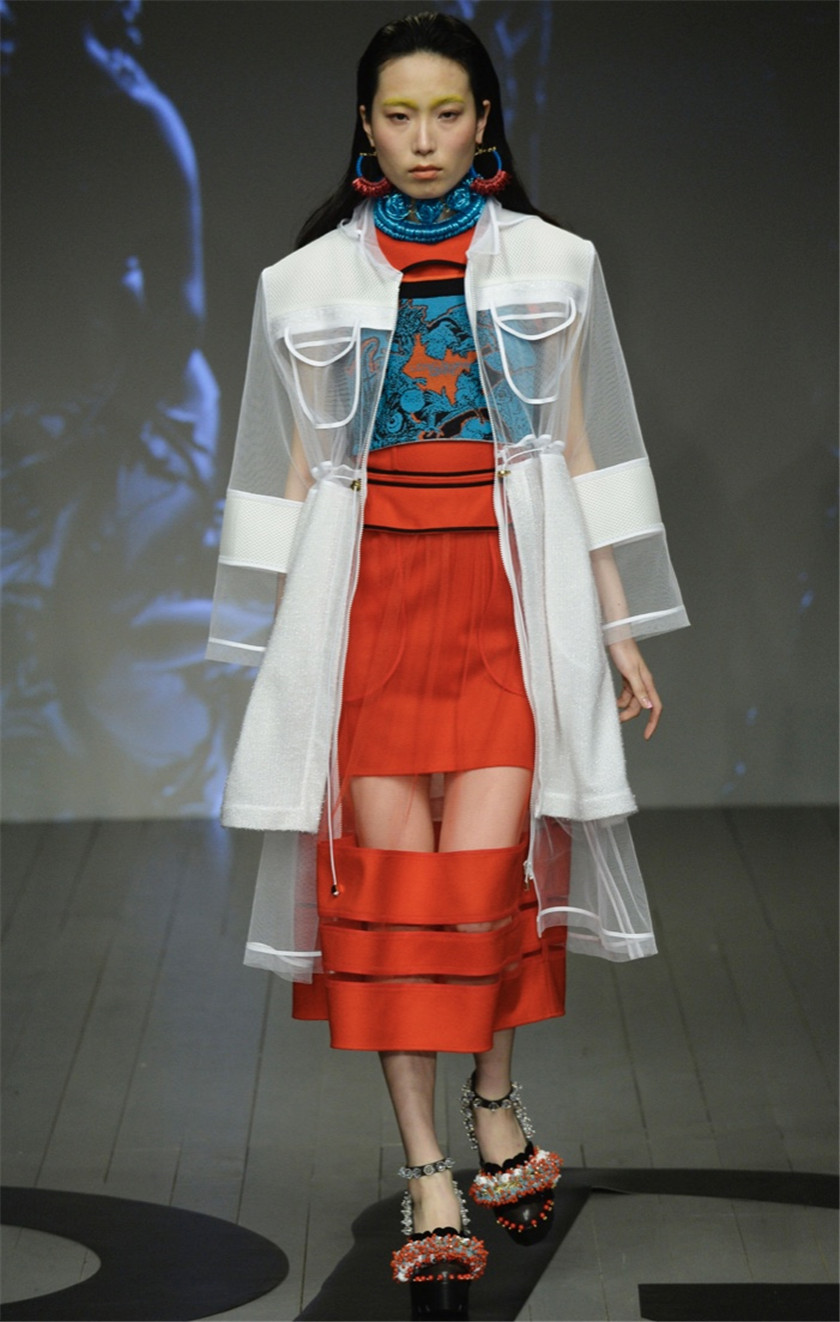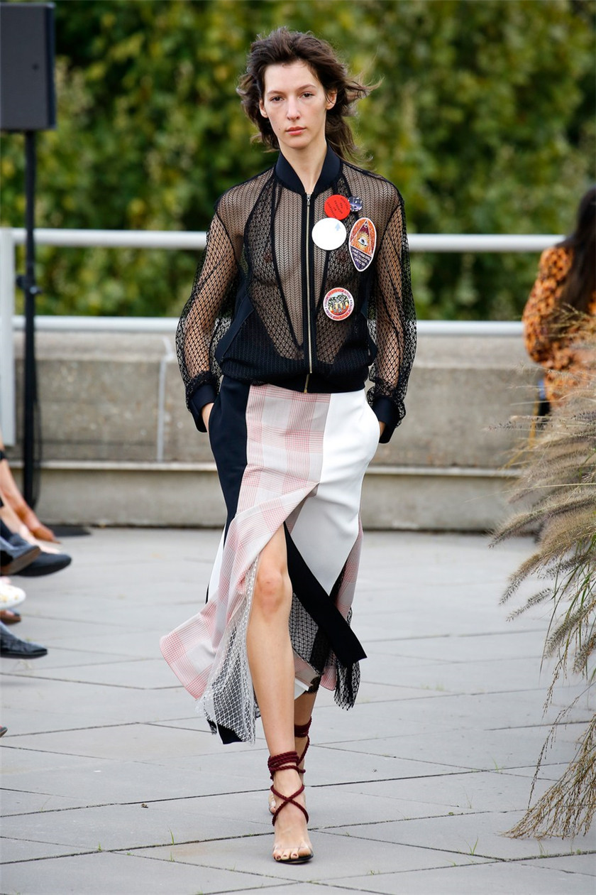 除了在裙子上进行的拼接On/Off也把这种设计带到了外套上。区别于上一季的完全的透明感,这种半透明材质加上拼接的设计使服装在整体呈现上更加的委婉。也增添了犹抱琵琶半遮面的美感。