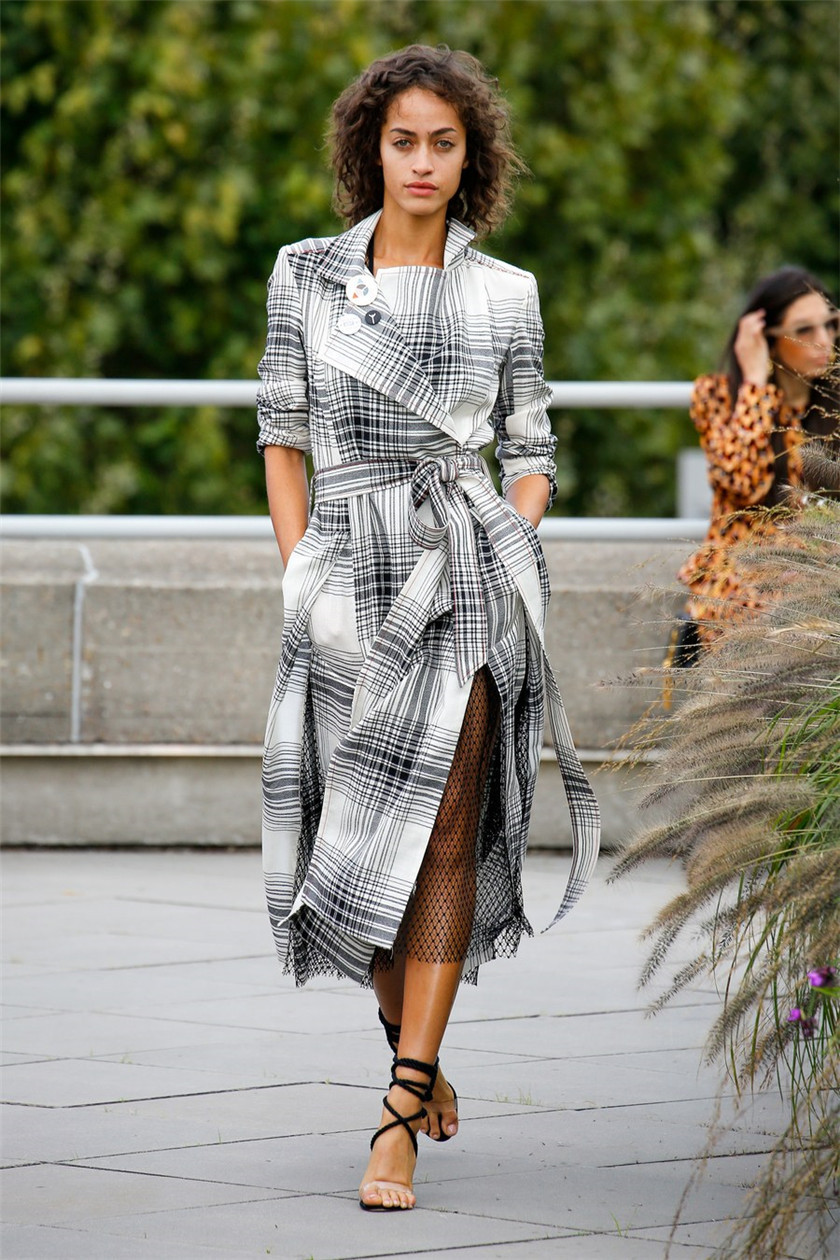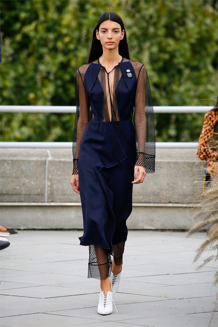 Roland Mouret也发现了这种有趣的设计。与On/Off选用的比较细腻的薄纱相比,Roland Mouret采用了大量的网格和小波点元素,并选用了同色系的长裙进行搭配,使其看起来更像是裙子底部延伸出来的半透明下摆。
