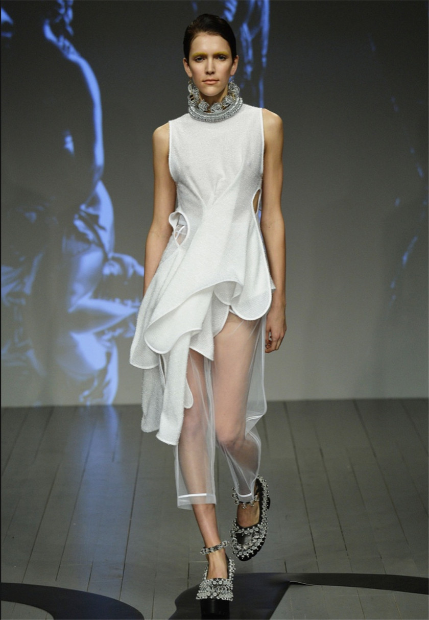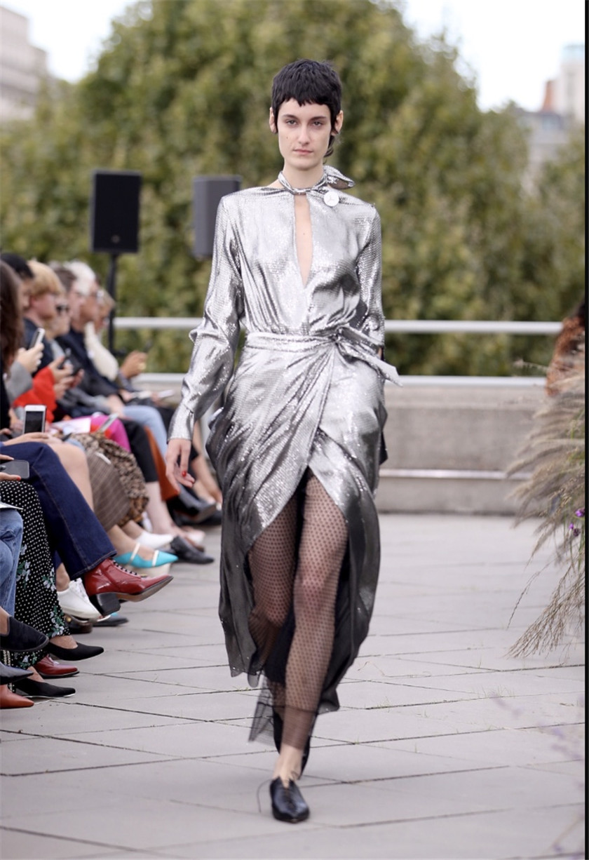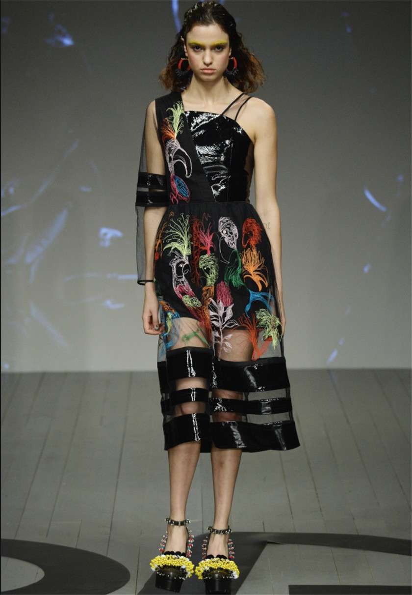 在伦敦时装周的最后一天,设计师们也把他们找到的折中的设计带到了秀场上。作为伦敦时装周日程中最后一个走秀的服装品牌,On/Off在开场中延续了以往浮夸、让观众不明所以的设计风格。在部分极度夸张的设计后,设计师以半透明的薄纱材质代替了去年在秀场上抢手的全透明PVC面料,并将这种半透明材质与反光面料以及棉布等进行了有趣的拼接,避免了以往PVC材质带来的闷热感和不透气性。