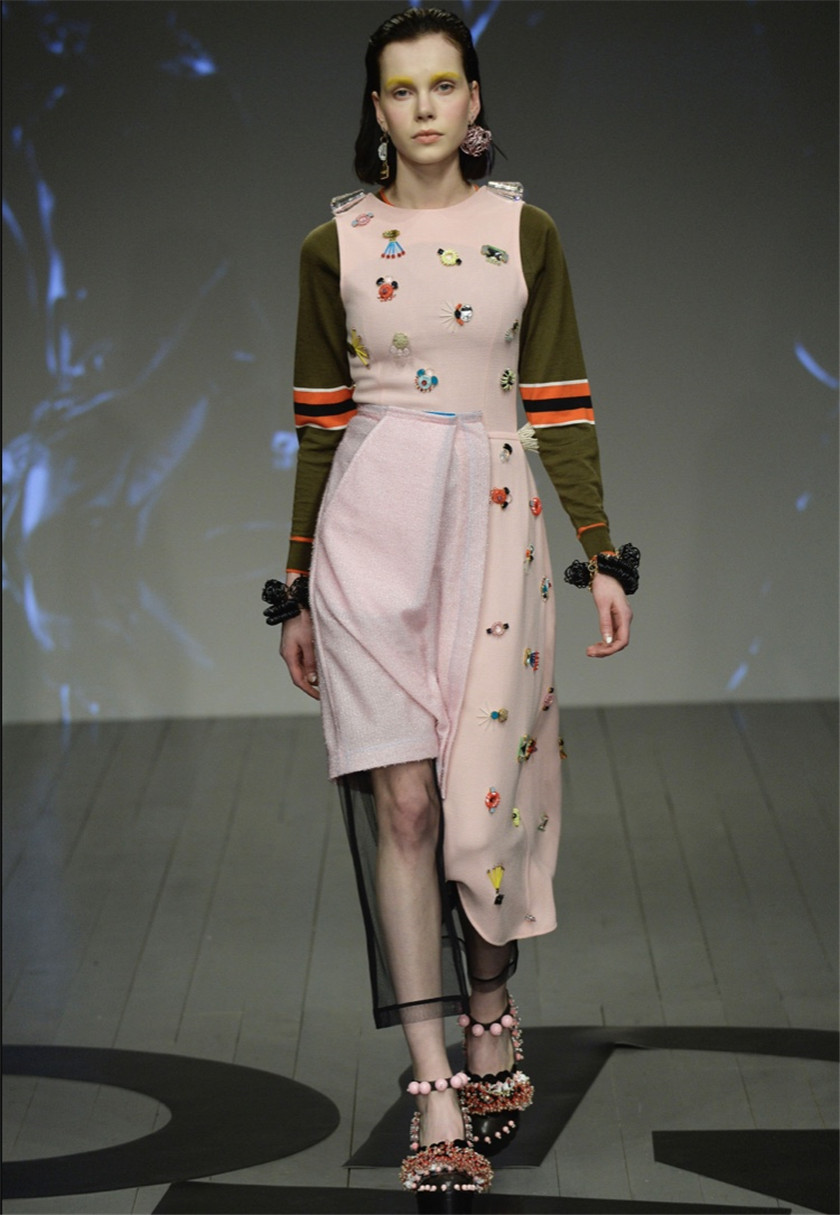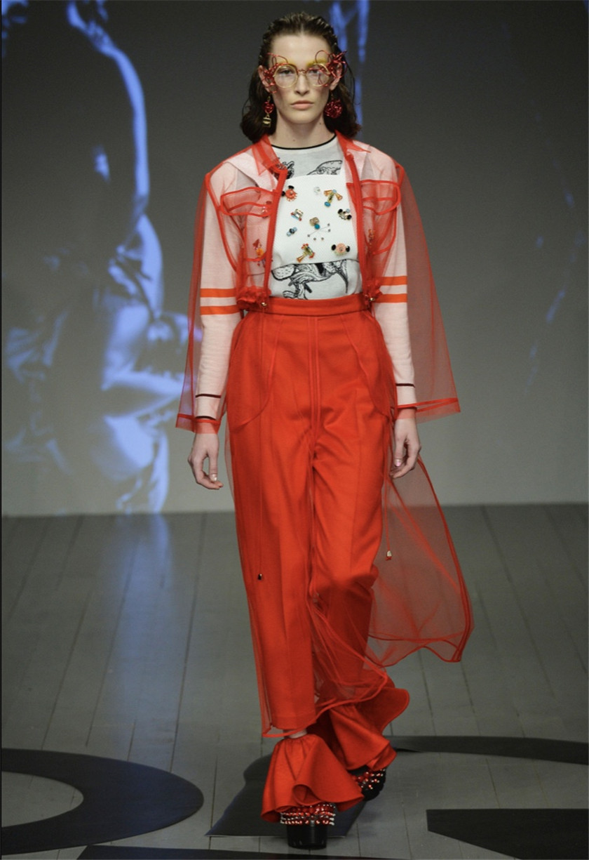 另一种对半透明薄纱材质的应用可以说在本季伦敦时装周上也是比较多见的设计。即将半透明的薄纱材质裁剪成普通九分裤的款式,用以搭配下半身的裙装。虽然在以往的认知中,以裙子搭配打底裤之外的裤子似乎显得过于繁琐邋遢,但薄纱的透明感刚好减轻了视觉上的负担,反而带来了一种比较新奇的视觉效果。