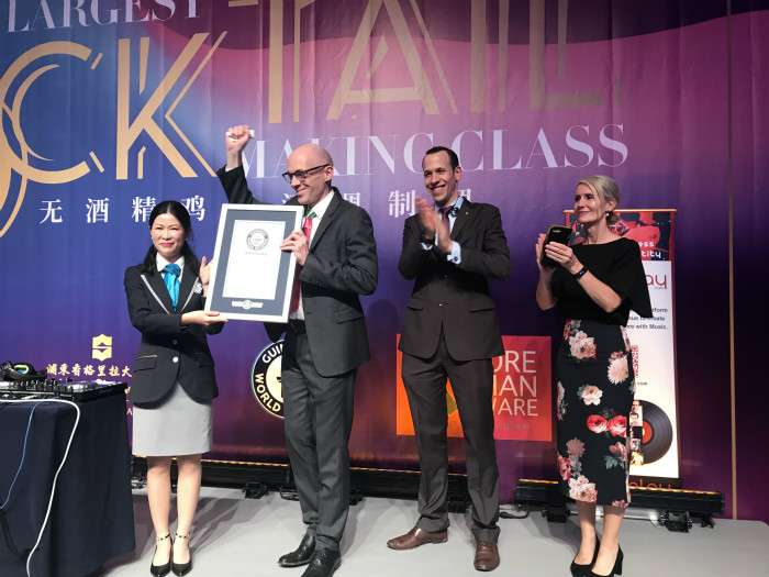 上海浦东香格里拉大酒店于2018年09月17日周一,成功打破 “最大规模的无酒精鸡尾酒调制课”的吉尼斯世界纪录称号。此次活动由1879人次同时参与,多数参与者来自癌症防治公益协会的乳腺癌康复者。 同时,酒店员工也积极参与此次挑战。此前,“最大规模的无酒精鸡尾酒调制课”的世界纪录,是由来自DIAGEO的1774位成员于2013年9月18日在西班牙巴塞罗那成功创下。
