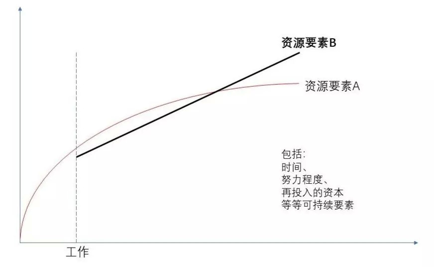 而资源要素B是需要持续不断投入的,相当于一家工厂要持续运营所需投入的原材料、人力资源、流动资金等。它的投入曲线基本上可以看成是一条向右上倾斜的直线。