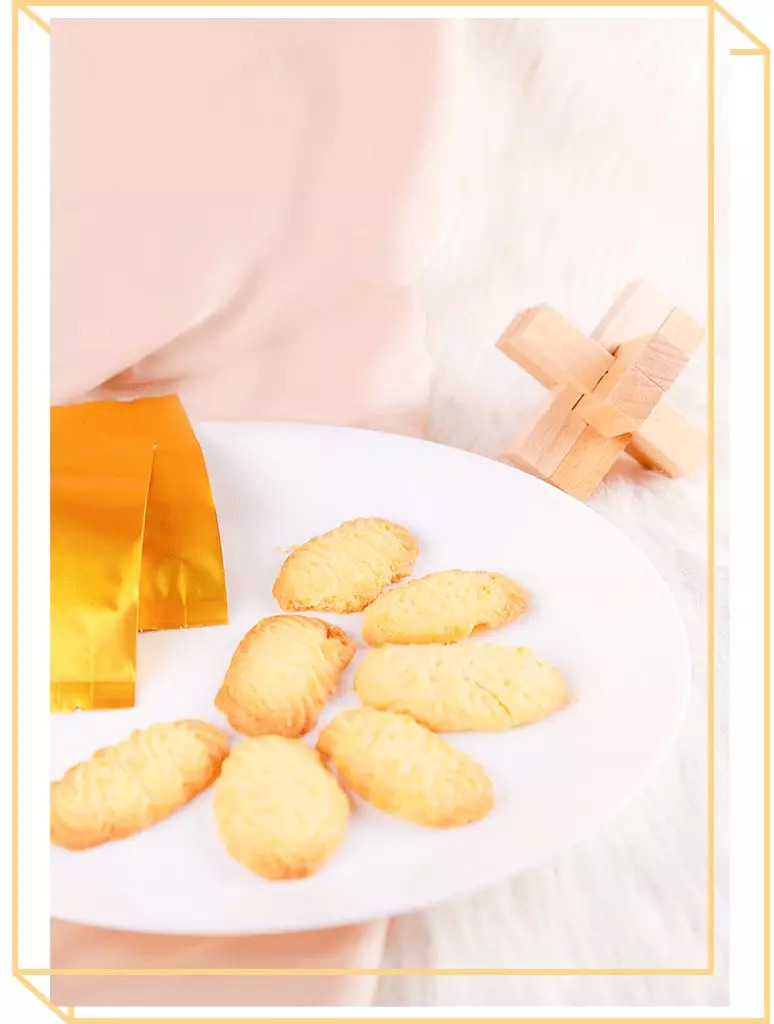 曲奇饼干是茶味的,里头添加了大吉岭红茶和可食用的天然玫瑰,长得很像怀旧小零食猫耳朵,甜度很低,怕甜的妹子应该会喜欢。保质期只有七天,不添加防腐剂