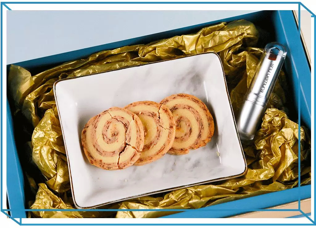 植村秀这次的中秋礼盒是蔡嘉的赤茶饼干 和口红 的搭配