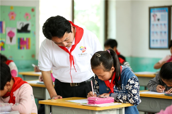 捐赠仪式过后,有趣的课程便开始了。以曹书记为首的公司领导们和志愿者穿上白T,戴上红领巾,走进教室,走上讲台,为孩子们带来英语、美术、摄影、音乐、手工课、科学实验等15大类课程。