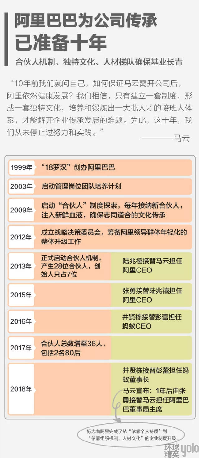 自阿里巴巴成立时,马云就对这家公司满怀希冀,“希望阿里能做102年,跨越三个世纪”。同时马云清楚的是,“谁都不可能陪伴公司102年,公司持久发展靠的是治理制度,文化体系和源源不断的人才梯队。”马云为阿里留下最重要的东西就是建立了一套制度,形成了一套独特的文化,还有一大批人才聚集的接班人体系。按照马云公开信中的说法,做出这个决定“已经准备了10年”,而这10年恰好是阿里从一家普普通通的互联网公司成为互联网巨头的10年。