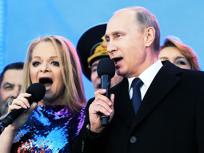 2. 3月18日,在莫斯科举行的“我们在一起”音乐会上,俄罗斯总统普京与女歌手Larisa Dolina一起唱歌,纪念克里米亚入俄一周年。