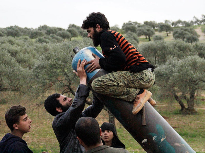 9. 3月18日,叙利亚伊德利卜省,反对派士兵填装一枚本地制造的炮弹。