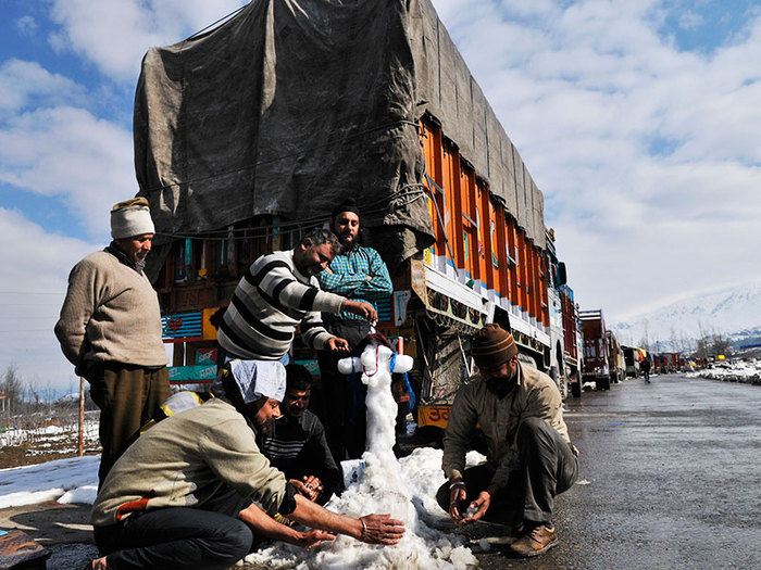 8. 3月18日,印控克什米尔地区斯利那加附近,大雪将山脉覆盖。在斯利那加-查谟国道因滑坡被关闭后,被困的卡车司机在路上堆起了雪人。