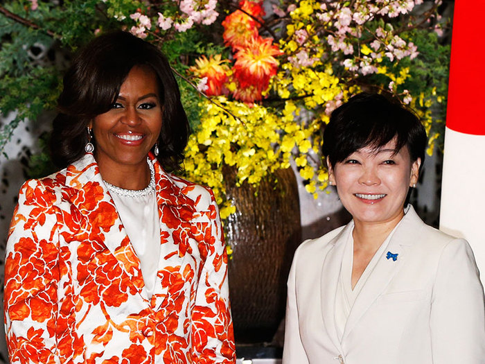 6. 3月19日,日本东京,美国第一夫人米歇尔·奥巴马(左)与日本首相夫人安倍昭惠会面,准备一同出席美日联合女生教育活动。