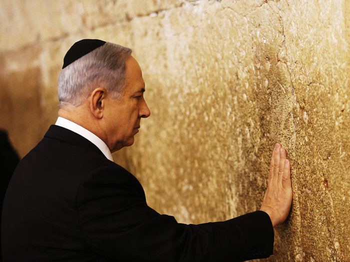 3. 3月18日,耶路撒冷老城,成功获得连任的以色列总理内塔尼亚胡面对“哭墙”祈祷。哭墙又称西墙,位于圣殿山山下西侧,是第二圣殿护墙的仅存遗址,长约50米,高约18米,由大石块筑成。犹太教把该墙看作第一圣地,教徒至该墙例须哀哭,以表示对古神庙的哀悼并期待其恢复。