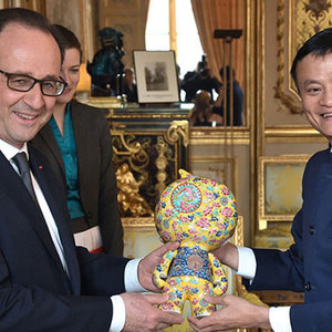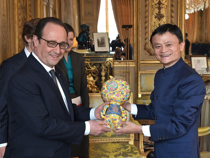 1. 3月18日,巴黎,法国总统奥朗德在爱丽舍宫接见阿里巴巴集团董事局主席马云。图为马云向奥朗德赠送礼物。