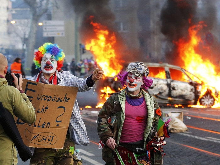 5. 3月18日,德国法兰克福,欧洲央行总部大楼正式开业,示威者点燃了停放在大楼外的警车。图为两名打扮成小丑的示威者从旁边走过。