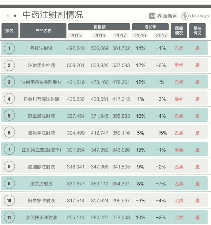 国内某知名中药厂家向界面新闻表示,中药注射剂发展至今,已经形成一个巨大的市场。目前销售规模在800亿元左右,140多个品种1000多个批文。据其提供的数据显示,截至2017年排名前20的中药注射液品种中,仅有注射用丹参多酚酸盐、康莱特注射液等5个品种的销售额在2017年实现了增长,而在2016年则是仅有5个品种的销售额出现同比下滑,其整体趋势可见一斑。