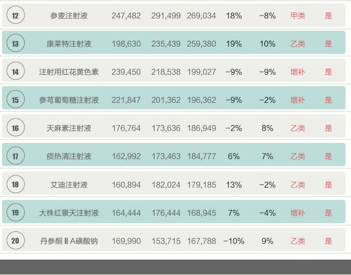 实际上,在2017年排名前20的中药注射液品种均有受控的情况,被限制病种,或者限制使用的医院。除丹参川芎嗪注射液,注射用红花黄色素,参芎葡萄糖注射液,大株红景天注射液在增补目录之外,剩下的全在医保目录。