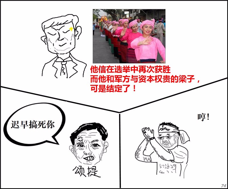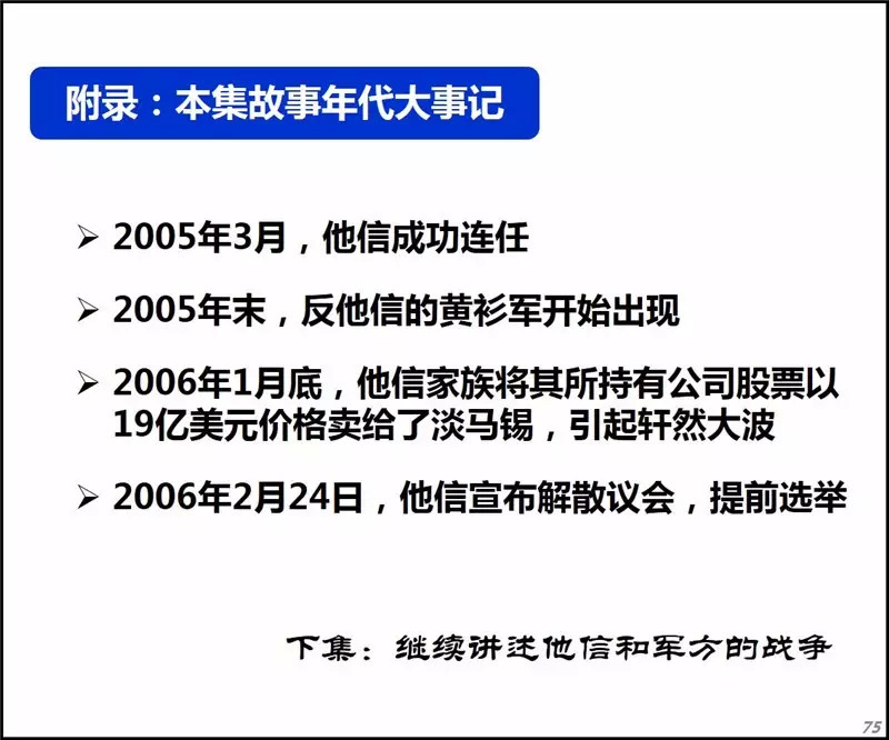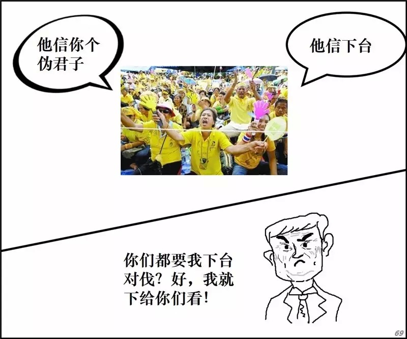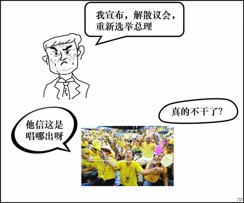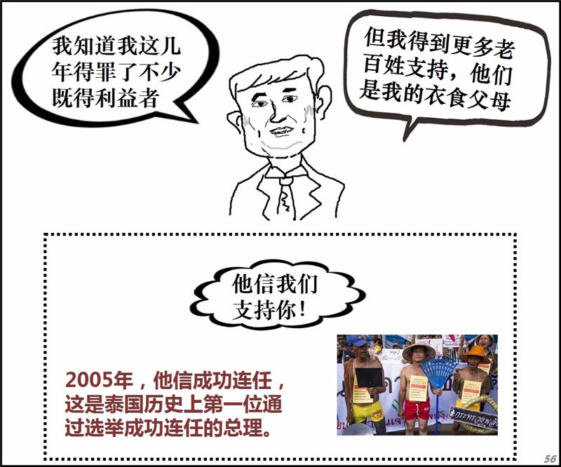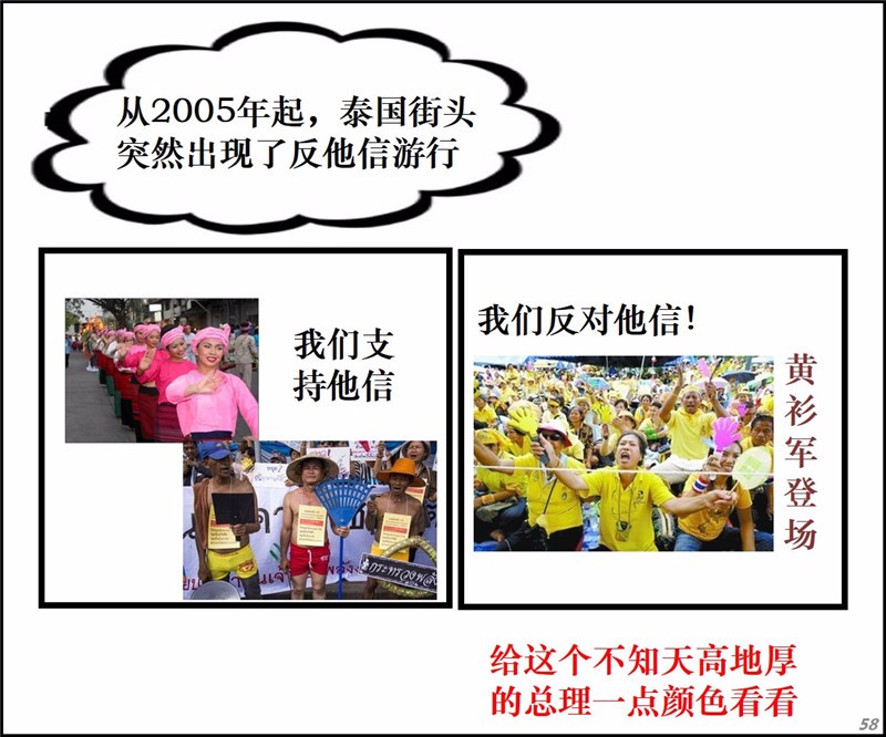 他信进行的政坛官僚改革动了既得利益者的奶酪,后来因为把所持公司股票卖给外国公司惹来了卖国的罪名,引发了抗议的浪潮。他信解散议会,重新选举并当选总理,但他与资本权贵和军队的梁子却越结越深。