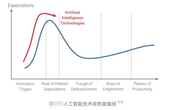 基于Gartner咨询公司在2013-2017年间所发布的技术成熟度曲线,《报告》对自动驾驶、虚拟助手和物联网平台等人工智能技术细分进行了归纳总结后发现,目前人工智能技术正处于膨胀期最高点。