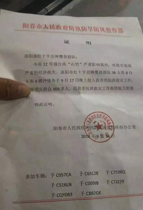 这其中就有一支来自河南的队伍,组织36名队员、8台车,携带救援设备驱车1700多公里赶赴灾区,协助当地政府部门开展救援工作。三天时间,共救出近600名受灾居民。救援结束后,广东省阳春市人民政府三防办为洛阳神鹰救援队开具一张救灾证明。