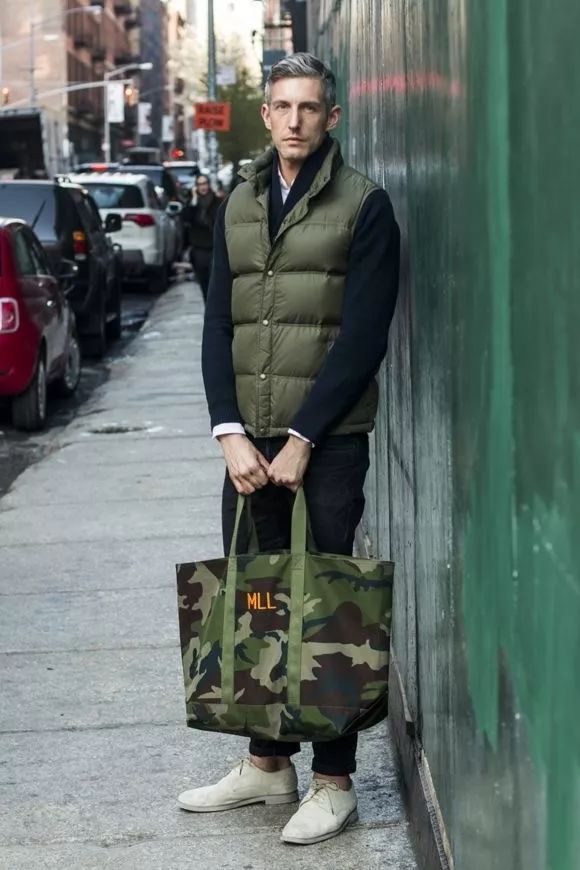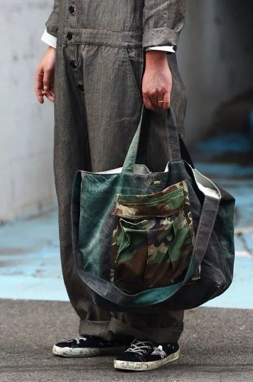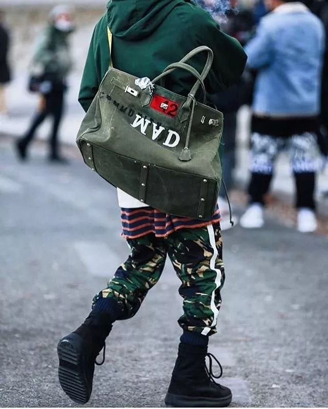 当迷彩作为造型中局部出现,会起到点睛之笔的作用,在整个造型中也会格外抢眼。最棒的选择是一款tote bag。