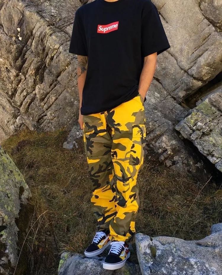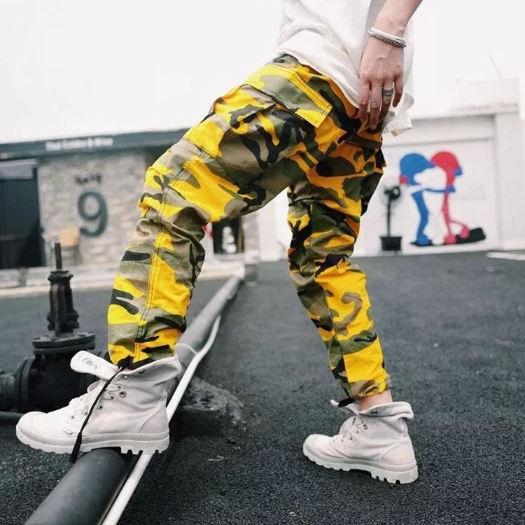 不同颜色的迷彩裤子也是一个不错的选择。比如亮黄色、紫色、白色都是当下不错的颜色搭配。