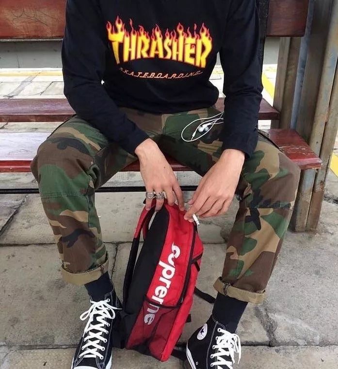 起源于欧洲战场的迷彩元素在街头显然被赋予了更多意义。所以你会看到无数潮人用它来搭配帆布鞋、T恤衫这些广受街头板仔欢迎的单品。