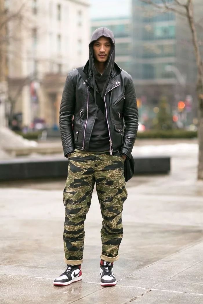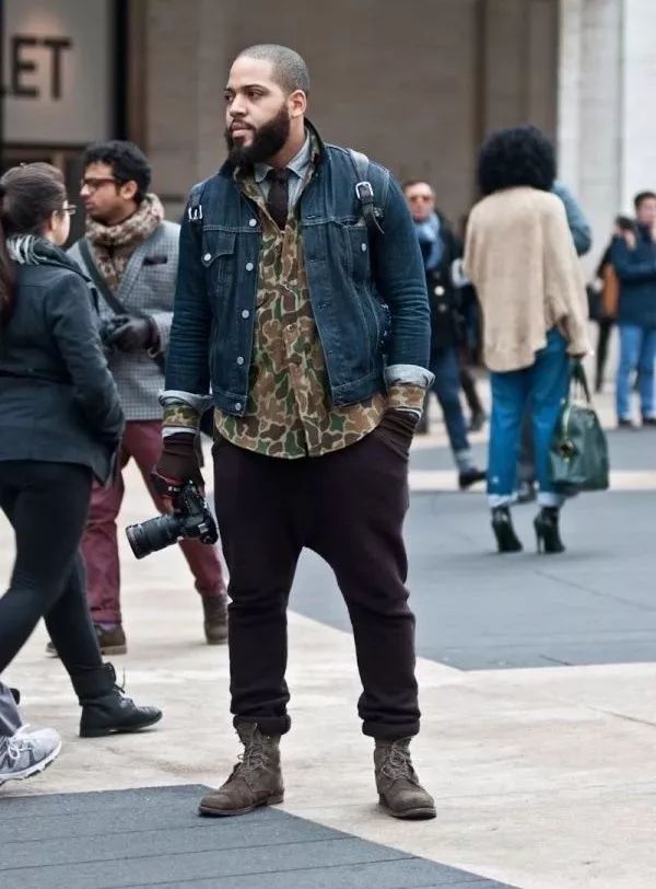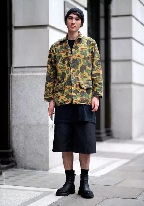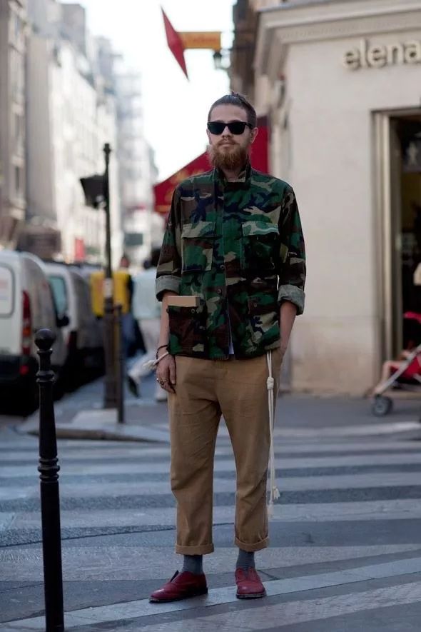 一双时髦的袜子和好看的靴子对于你穿着迷彩裤绝对有加成作用。随意将裤口塞进去就会很时髦。