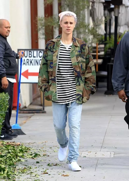 不光平日街拍爱迷彩,就连与卡尔老爷子见面都穿着迷彩飞行员夹克。