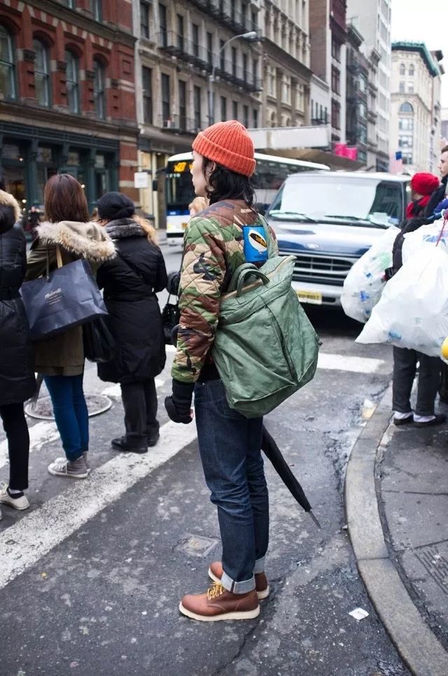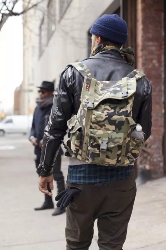 拎上一款迷彩图案的大尺寸tote bag 出门无疑是抢眼的。但双肩背包同样很火,而且受众更广。