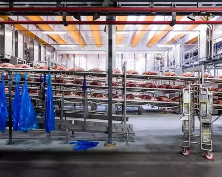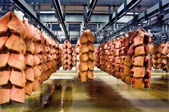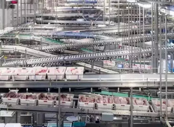 皇冠集团的屠宰场,有10个足球场大,输送带总长度超过11公里。旺季时,每天至少有2万只猪送来这里进行加工处理。