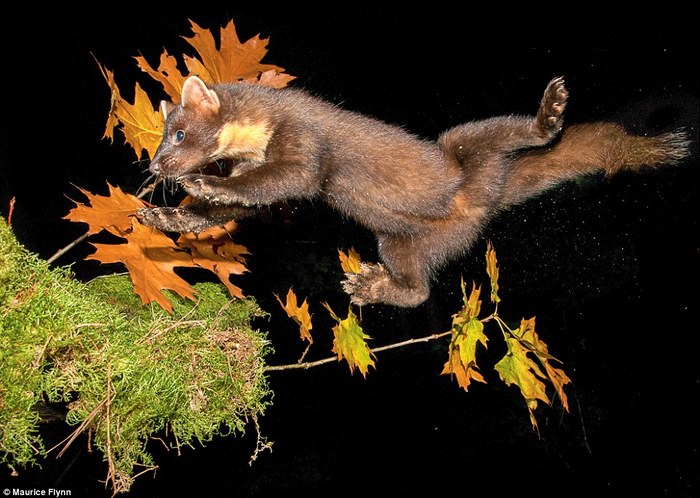 1. 在爱尔兰的沃特福德郡,一只松貂正在树木间跳跃。 因为松貂不在白天出现,为了拍到这一幕,46岁的摄影师Maurice Flynn设好相机陷阱,在树林里等了一夜。这张照片夺得这次摄影比赛的第一名。