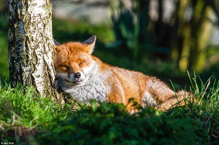 2. 一只狐狸靠在树旁,看起来像是在打瞌睡。充足的阳光让画面看起来很温暖。