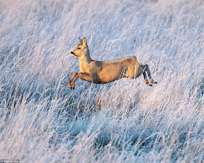 7. 剑桥郡芬兰区,一只狍在结霜的地上跳跃,尝试在寒冷的早上保暖。