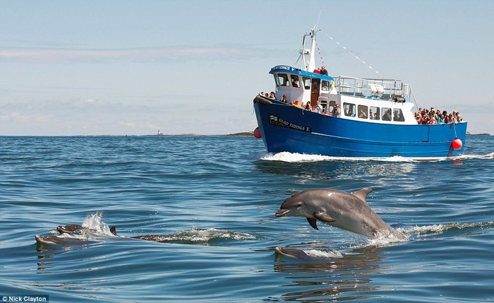 8. 法恩群岛附近,宽吻海豚在水中畅泳。不远处船上的游客在忙着用相机捕捉。