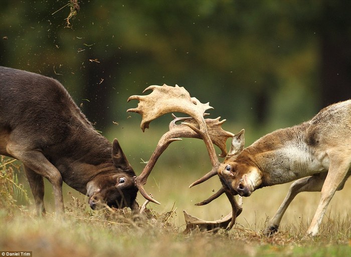 9. 伦敦的里士满公园内,两只公鹿为争夺异性而开始搏斗。
