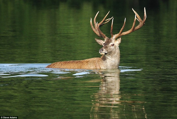 12. 诺丁汉郡的Wollaton公园里,一只马鹿走在湖里。