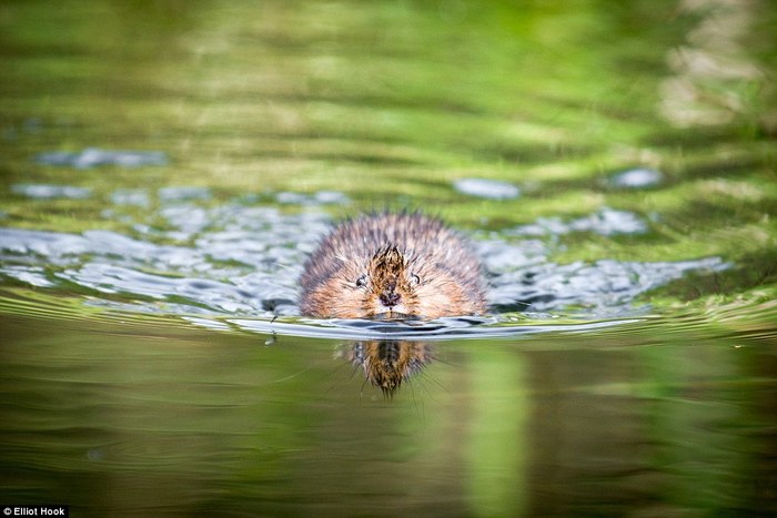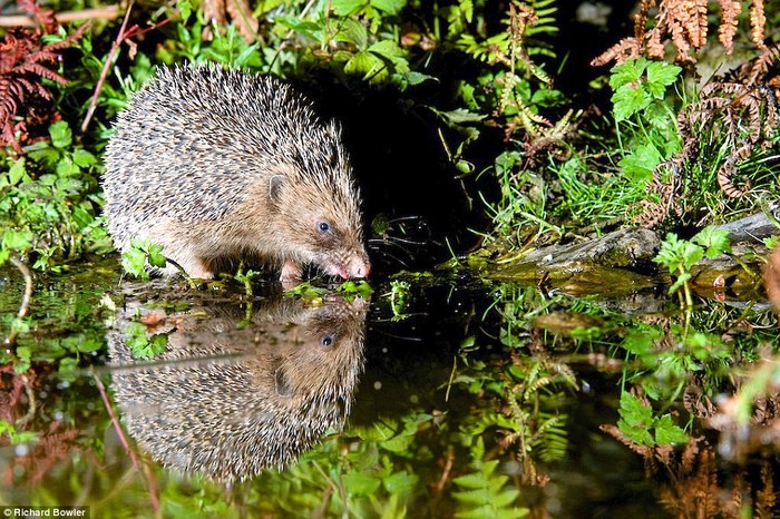 15. 威尔士登比郡内,一只刺猬好像正在欣赏水中自己的倒影。